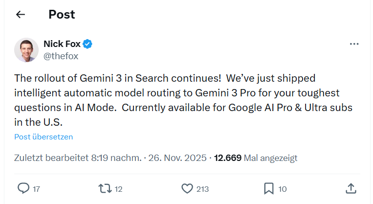 Nick Fox, Senior Vice President Knowledge & Information, gab auf seinem X-Account bekannt, dass Google bei komplexen Suchanfragen auf Gemini 3 Pro zurückgreift. Das allerdings vorerst nur in den USA und für Pro- sowie Ultra-Nutzer.